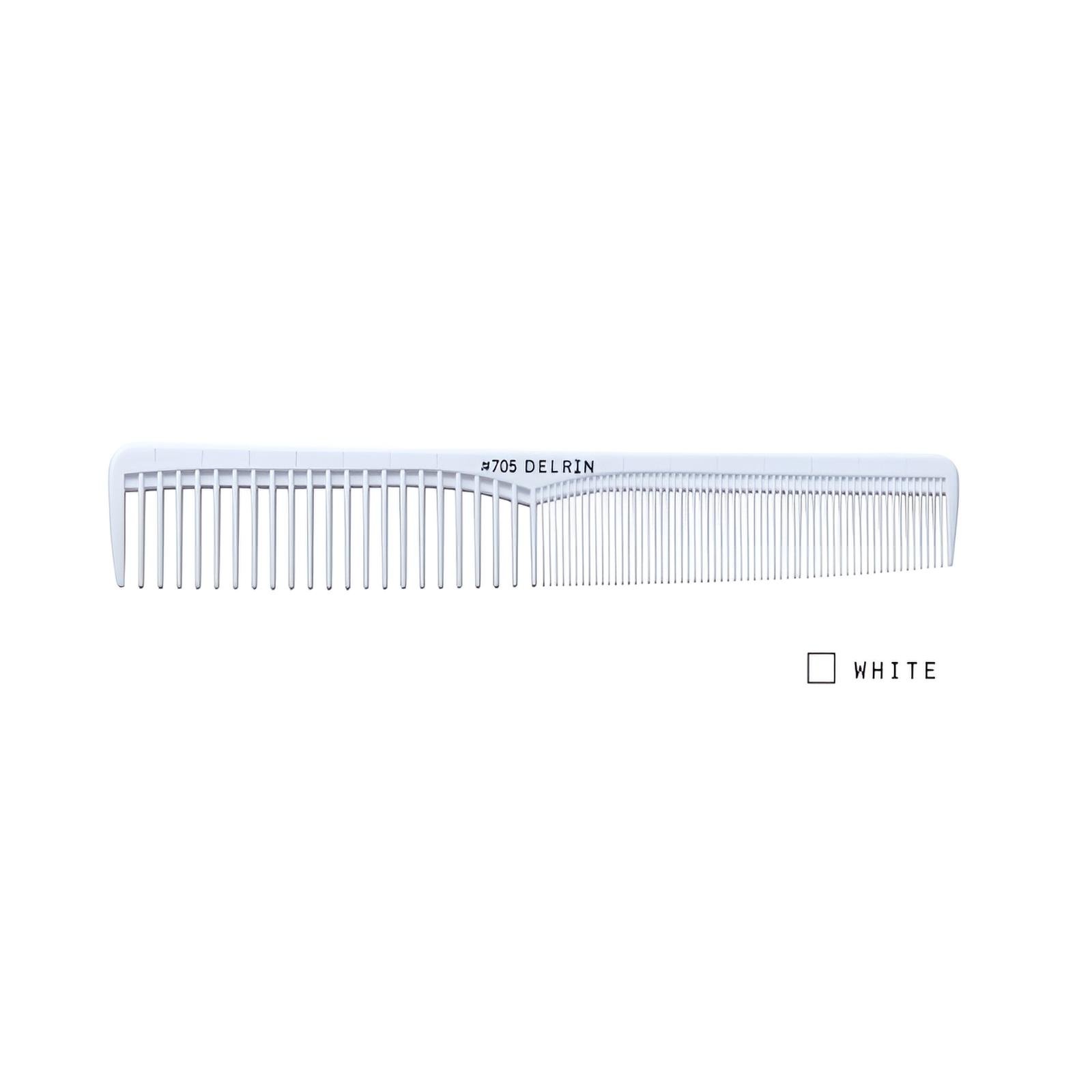 Η Delrin 705 είναι ένα προϊόν με μακρά παρουσία κι υψηλές πωλήσεις, καθώς διαθέτει ισορροπημένο σχήμα, μήκος κι ευκολία στη χρήση. Αυτή η κλασική χτένα κουρέματος έχει τμήμα μεσαίων δοντιών για να πιάνει μεγαλύτερες τούφες, διατηρώντας την τάση και περνώντας εύκολα μέσα από στεγνά μαλλιά. Το τμήμα με τα πυκνά δόντια της Delrin 705 είναι ιδανικό για τεχνική «ψαλίδι πάνω σε χτένα» ή για τράβηγμα και διατήρηση τάσης σε βρεγμένα μαλλιά για κοπή ακριβείας. Οι άκρες των δοντιών έχουν υποστεί ειδική επεξεργασία ώστε να μην γρατζουνίζουν το τριχωτό της κεφαλής. Το πάχος των δοντιών είναι λεπτό για ομαλό χτένισμα, με κατάλληλη σκληρότητα και εξαιρετική αντοχή στη θερμότητα, στις χημικές ουσίες και στη φθορά.